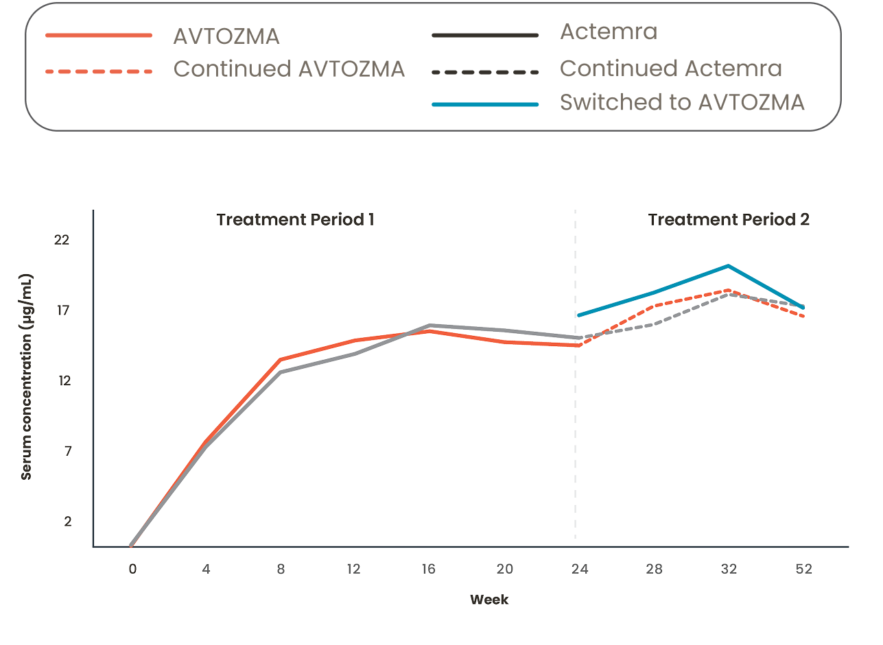 • Patients receiving the 8 mg/kg dose of AVTOZMA demonstrated serum concentrations comparable to those taking the same dose of Actemra at all measured time points1,5,6